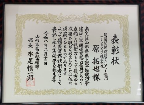 弊社 取締役 原拓也が「令和7年度 山形県県土整備部優良建設工事等技術者表彰」を受賞しました。